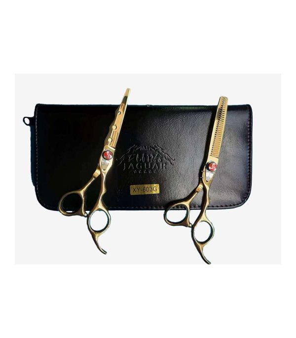ست قیچی جگوار طلایی ( کات و کوتاهی – پیتاژ – XY-603G) ، از برند معتبر جگوار مناسب برای آرایشگران حرفه ای و مبتدی است که کار کات و کوناهی و همچنین کار پیتاز و خورد کردن مو را به راحتی انجام می دهد.