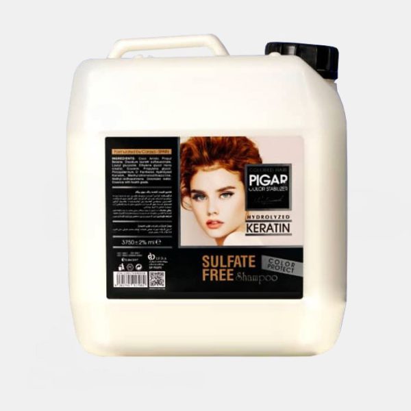 شامپو گالنی بدون سولفات پیگار حجم 3750 میلی لیتر به کمک کراتین موجود در آن مو را آبرسانی کرده و ساقه مو را بازسازی میکند.