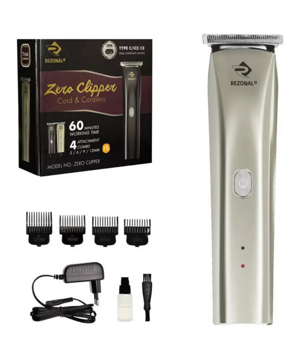 ماشین اصلاح سر و صورت رزونال زیرو کلیپر Rezonal zero clipper ماشین اصلاح برای کارهای کوتاهی حرفه ای سر مناسب برای استفاده حرفه ای و شخصی است که مجهز به تیغه استیل ضد زنگ می باشد و همانطور که از نامش مشخص است قابلیت صفرزنی موها را دارد و همچنین برای کوتاه کردن موها در اندازه های دلخواه به 4 شانه اتصال به تیغه در انداز های3،6، 9 و 12 میلی متر است .