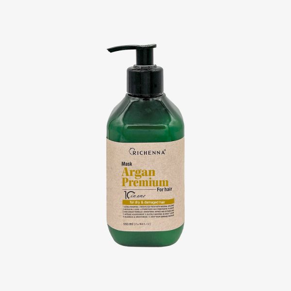ماسک مو بدون سولفات بعد حمام ریچنا مدل آرگان 550 میلی لیتر یک درمان بینظیر و چندمنظوره برای موهای آسیبدیده است که غنی از روغن آرگان می باشد.