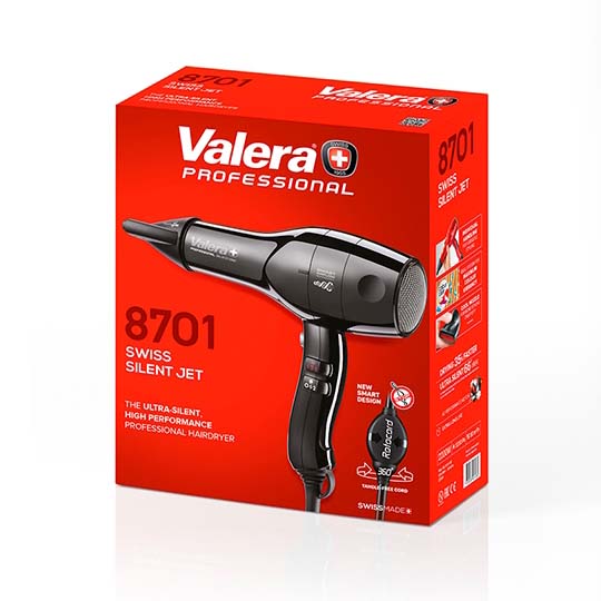 سشوار حرفه ای والرا سری Swiss Silent Jet مدل 8701  مجهز به ژنراتور تولید یون جهت حفظ سلامت و رطوبت مو ، مجهز به سیستم تنظیم باد و حرارت با بهره گیری از کلید های شش حالته و مجهز به کلید باد سرد می باشد .