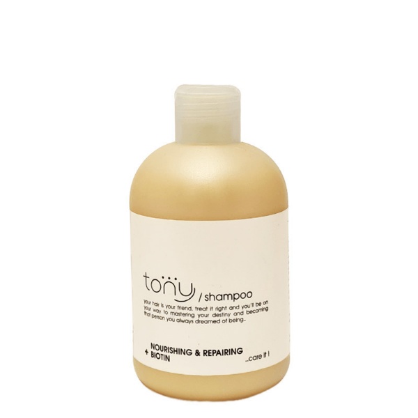 شامپو تونی مخصوص موهای آسیب دیده و شکننده محصولی از برند ایرانی تونی است. این محصول، آبرسان، مرطوب کننده و ترمیم کننده ساقه مو بوده که به واسطه مواد مغذی به کار رفته در فرمولاسیون خود، موهای خشک و آسیب دیده را احیا می کند. پروتئین و کراتین هیدرولیز شده موجود در این شامپو موجب تقویت موهای ضعیف می شود.