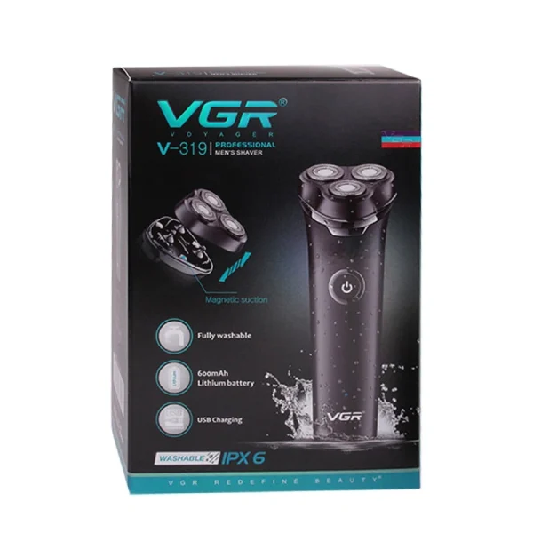 ریش تراش سه تیغ وی جی آر مدل V-319 قدرتمند با تکنولوژی اصلاح بصورت برش چرخشی با تیغه های مگنتی عرضه شده است که شما میتوانید در سالن و استفاده شخصی از آن بهرمند شوید. طراحی این ماشین اصلاح بصورت ارگونومیک می باشد منبع تغذیه باتری لیتیومی 600 میلی آمپر قابل شارژ می باشد. که شارژ کامل آن 1 ساعت زمان نیاز دارد و قابلیت استفاده تا 90 دقیقه کار را دارد .
